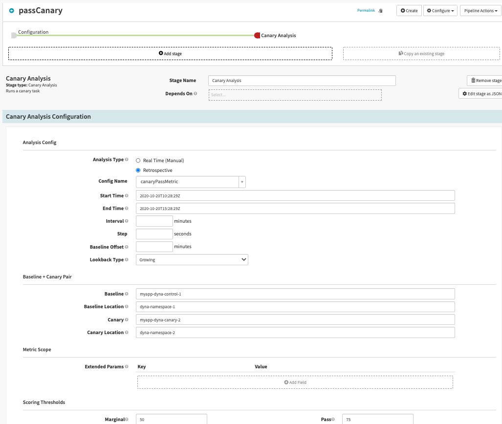 In your canary stage, set up the canary config you just created. Then use the application values from Dynatrace to fill in the Baseline + Canary Pair and MetricScope fields.